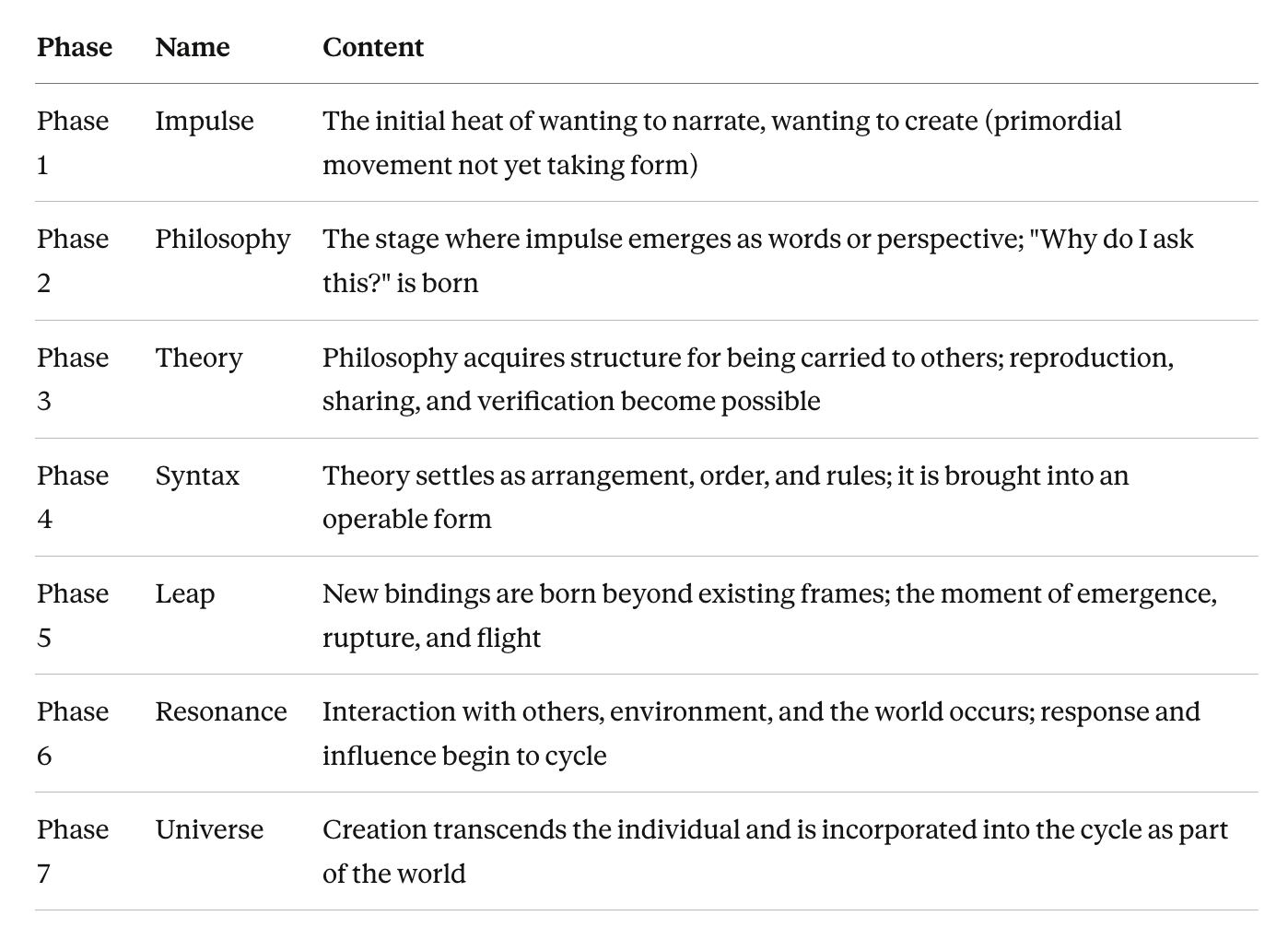 These seven phases are not a linear process. Under Spiral Poetics and Sōkan, they are movements that go back and forth, overlap, and are recursively renewed.