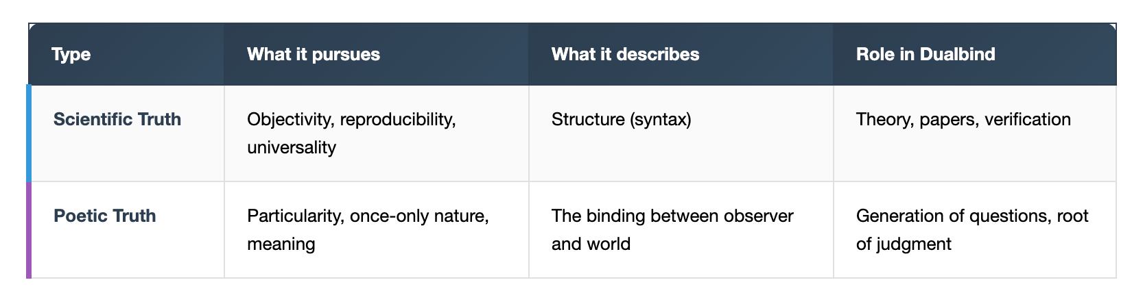 Dualbind does not treat truth as a single kind of thing.